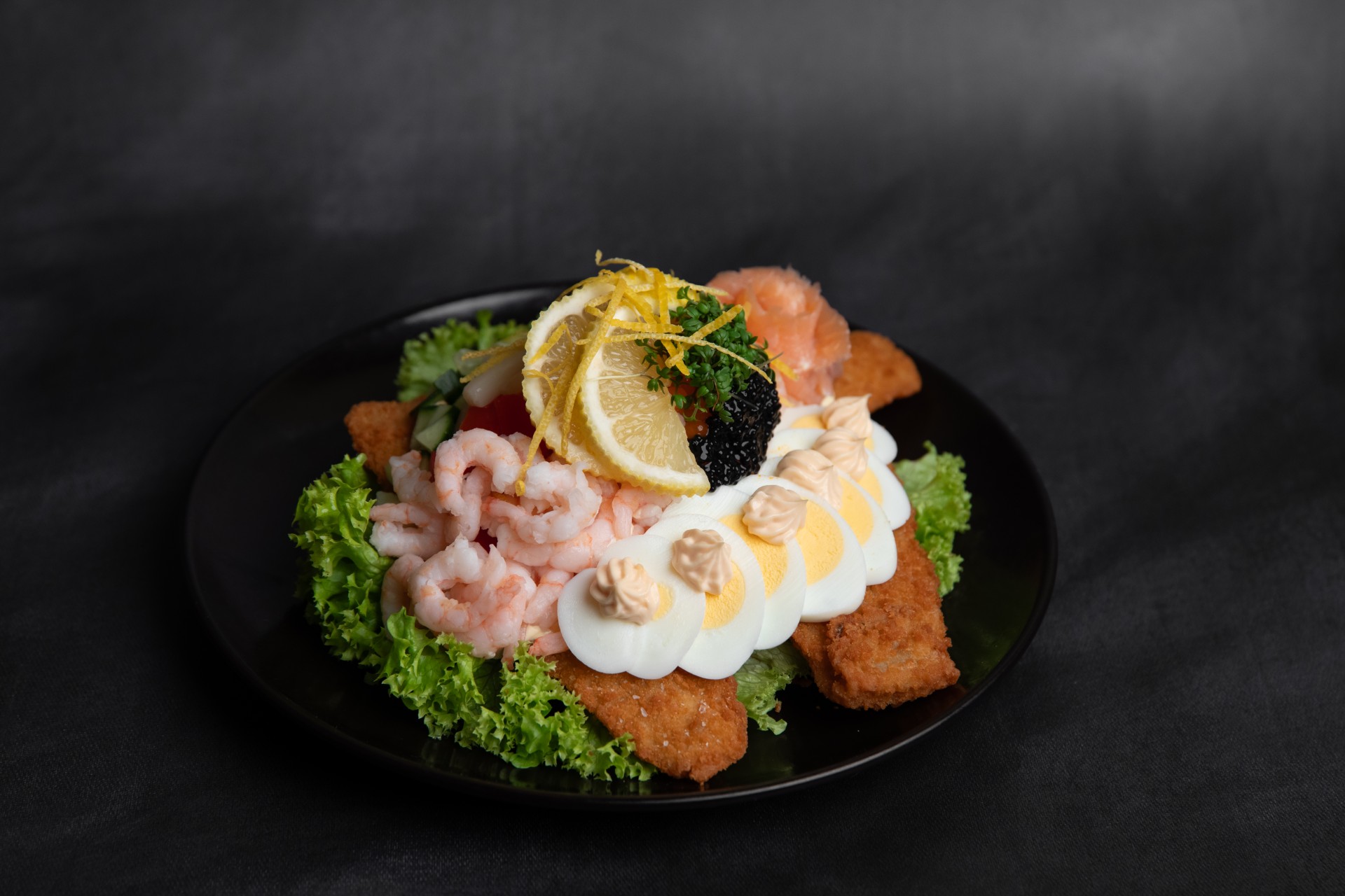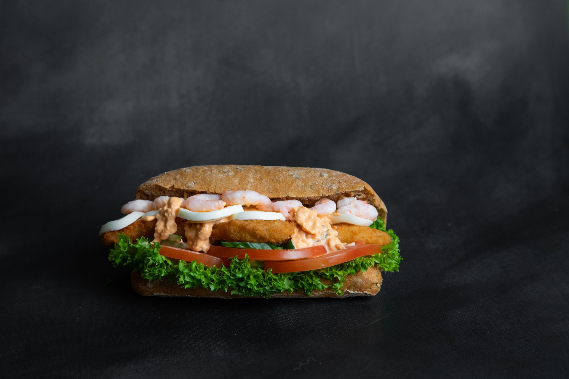 Rødspættefilet, æg, mayonnaise, burgerdressing, salat, revet agurk, tomat og rejer i mørk Ciabatta brød