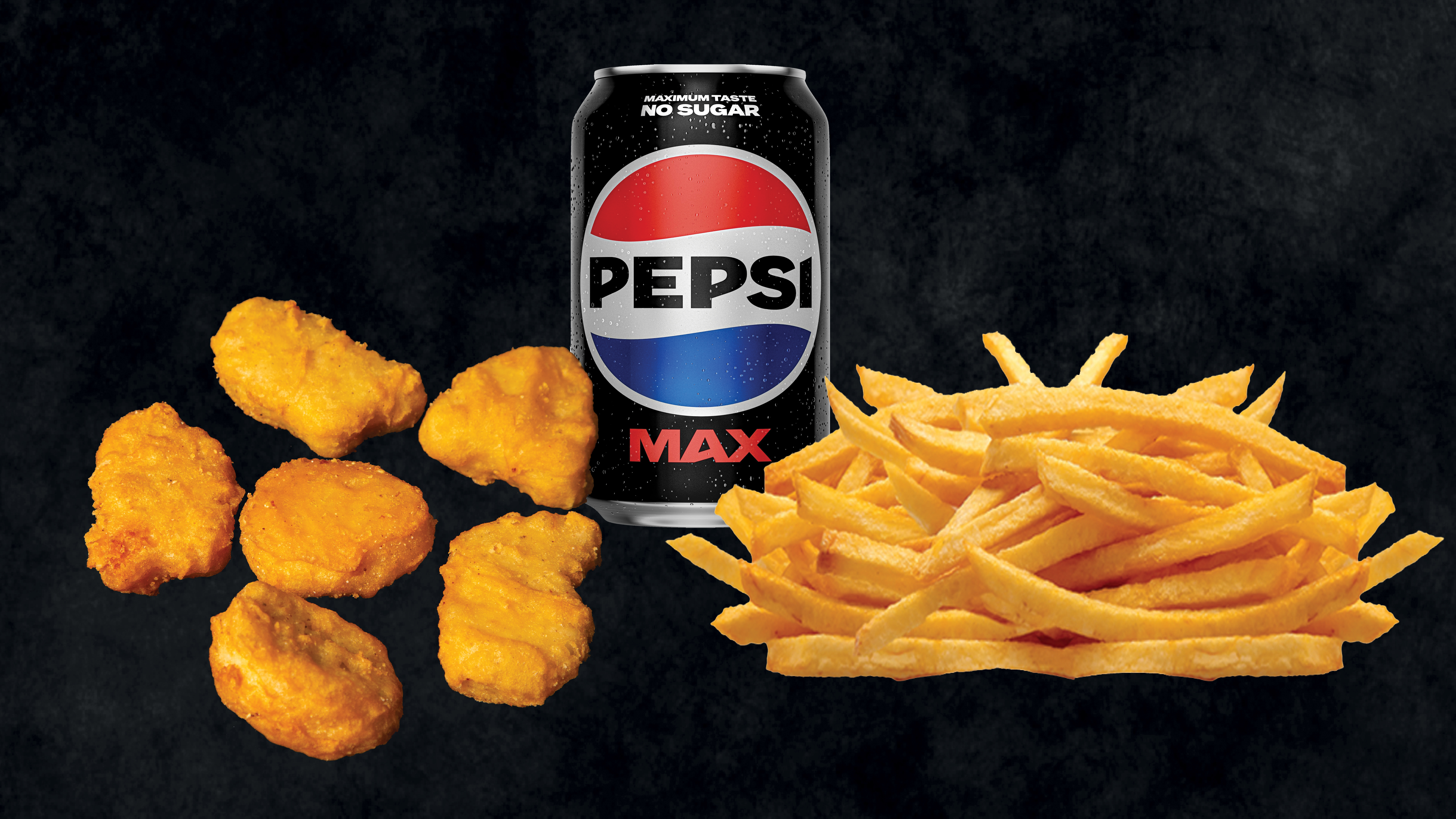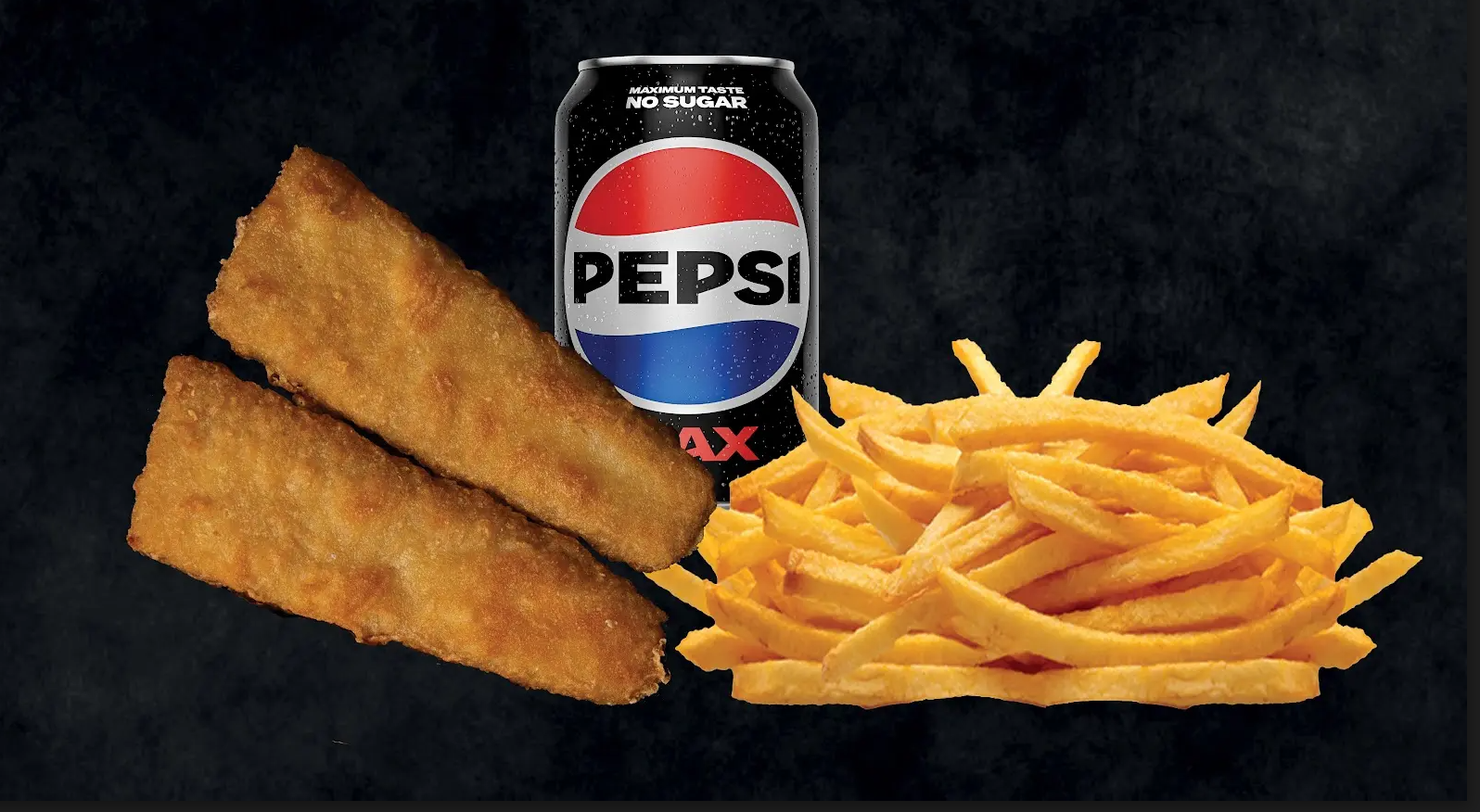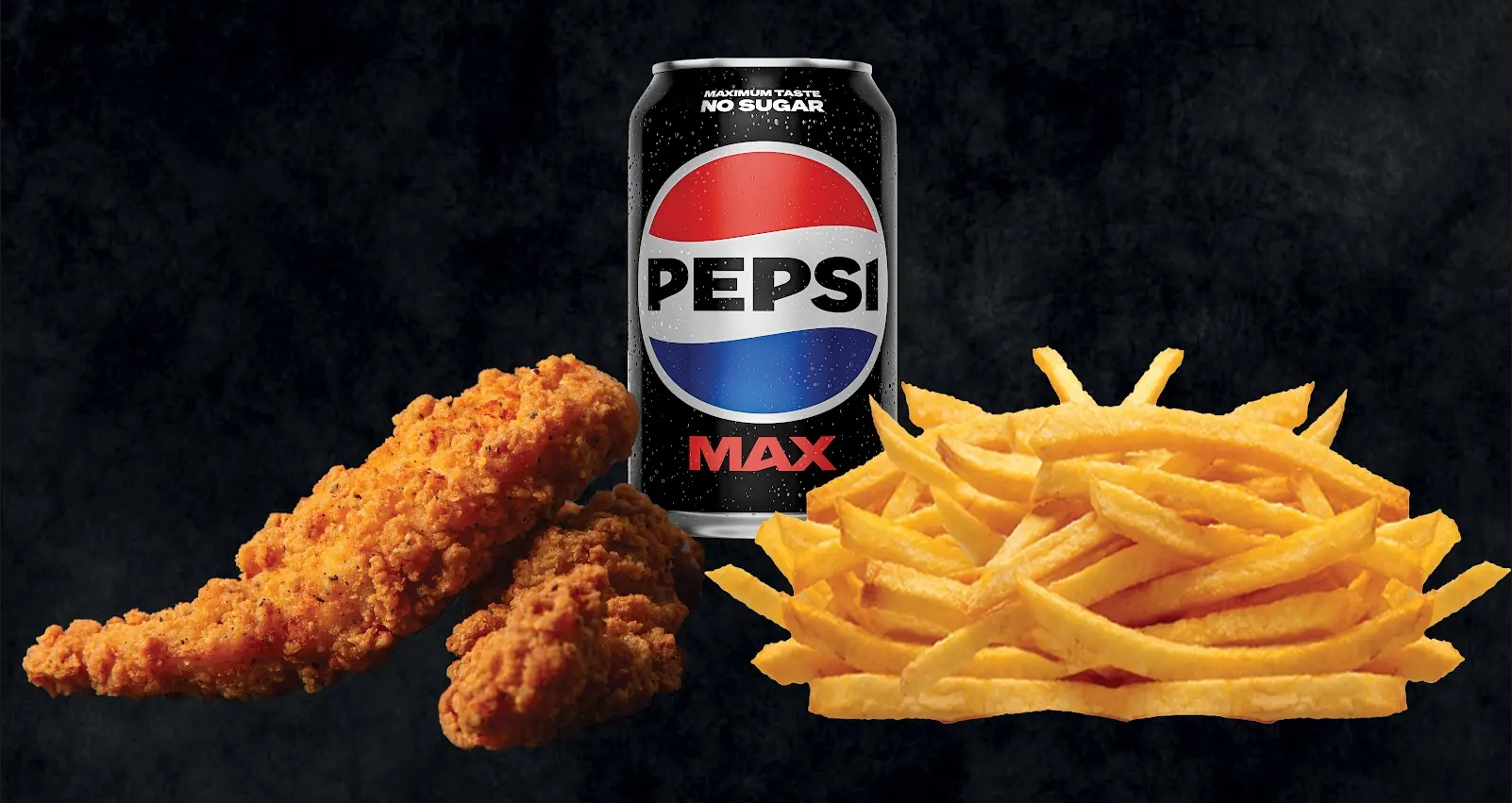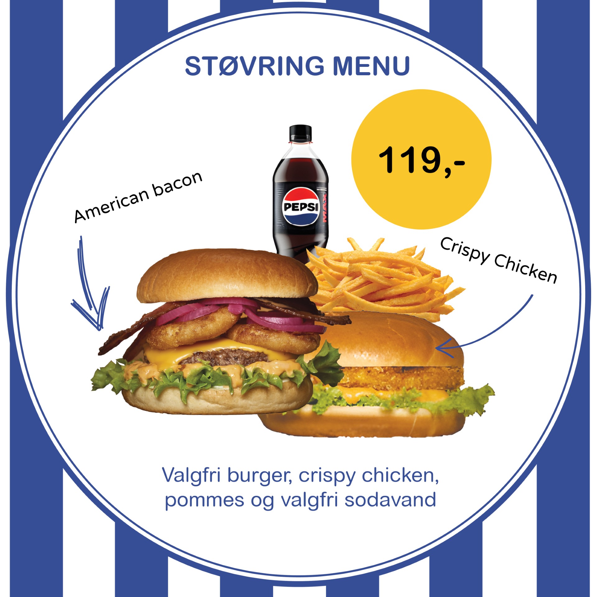 1 valgfri burger, 1 crispy chicken, pommes frites og 1 valgfri sodavand