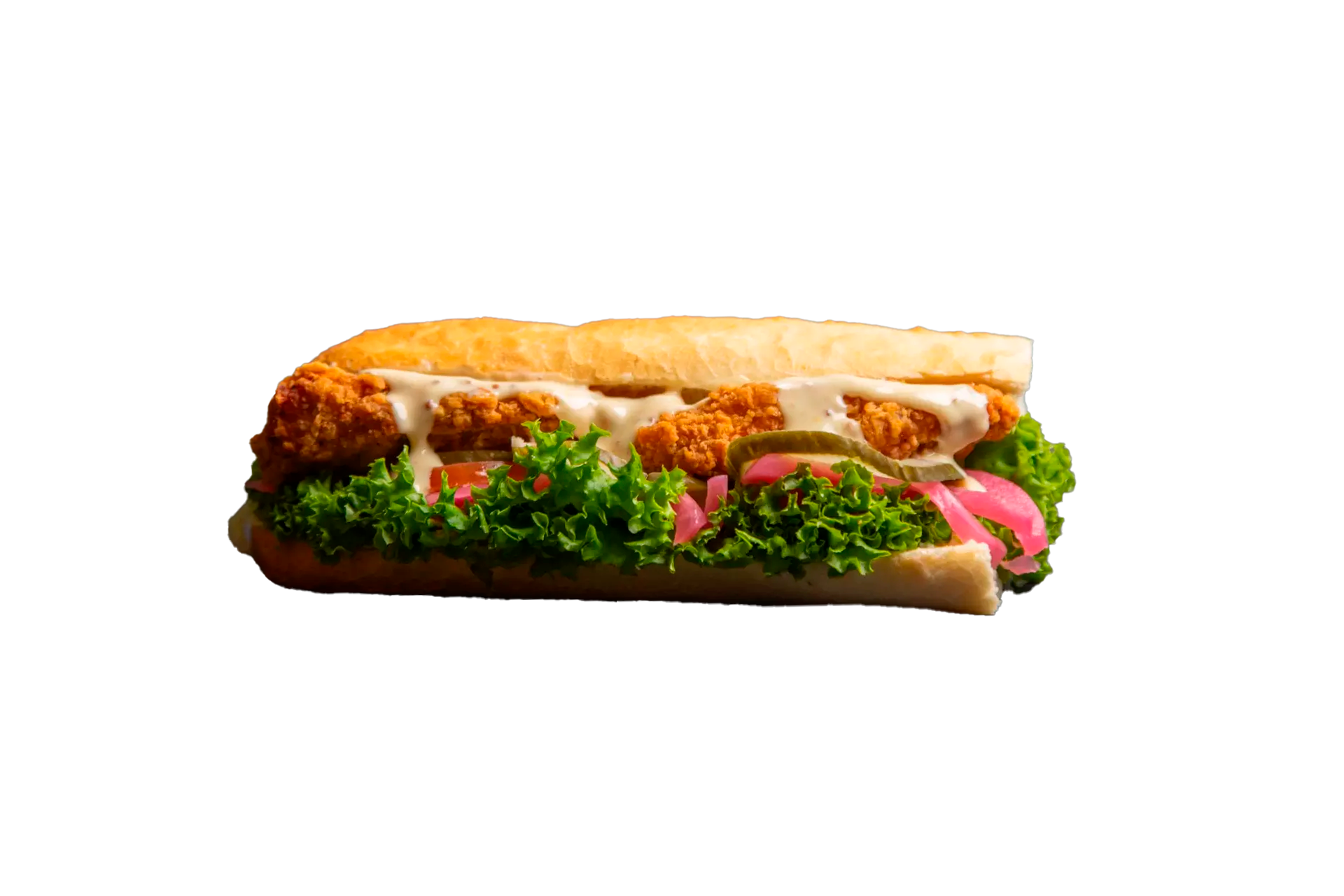 Chicken tender sandwich m. hjemmesyltede rødløg/agurk, honey mustard dressing