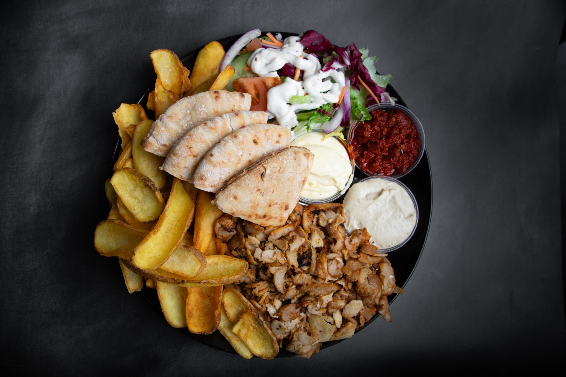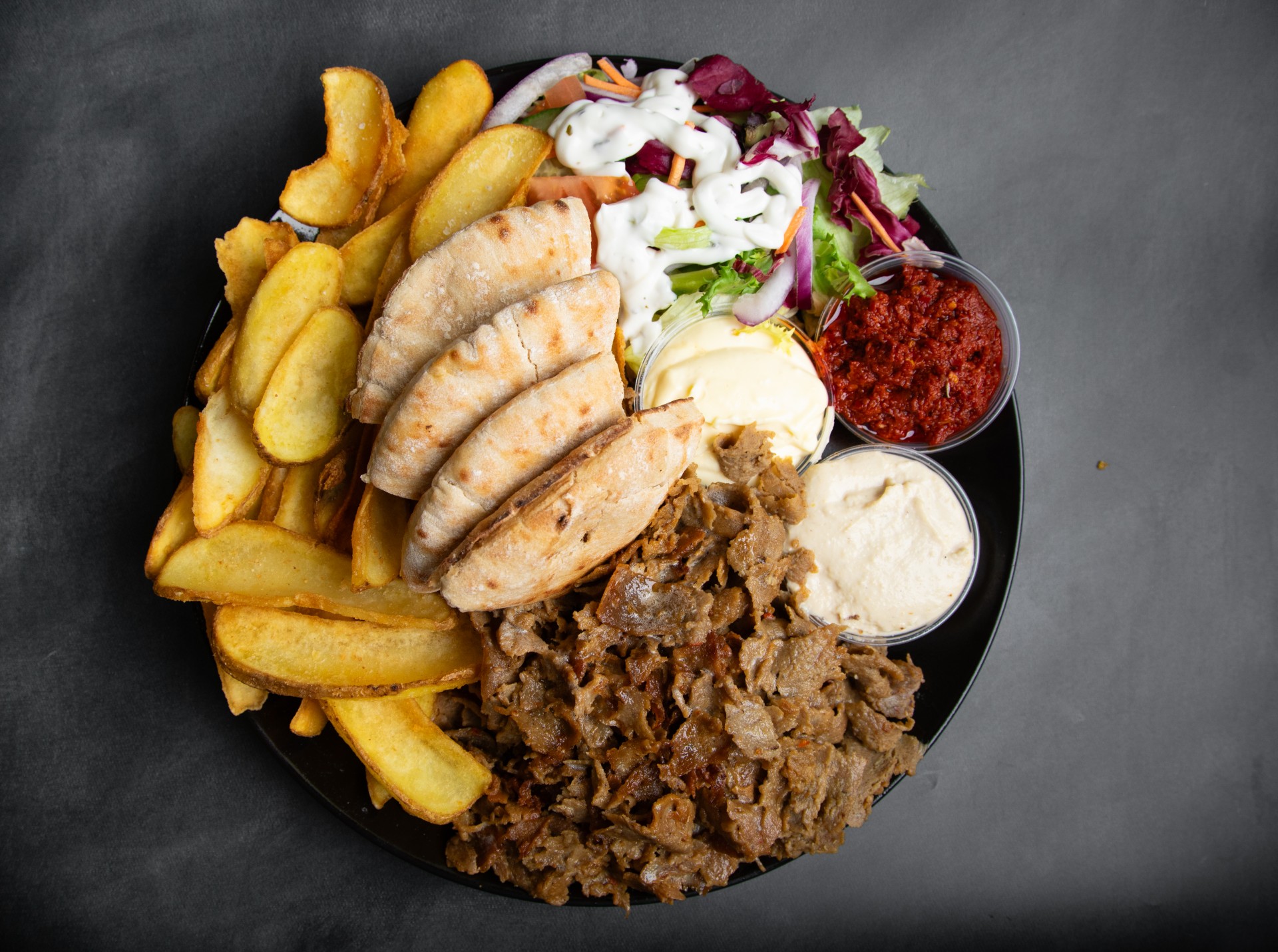 Shawarma, hummus, chili, hvidløg, American style pommes frites, pitabrød, salat og dressing.