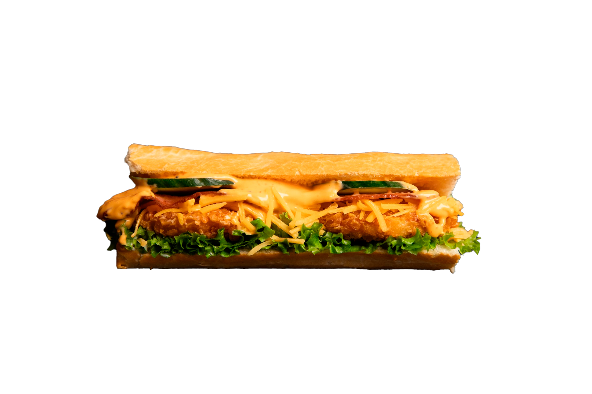 Hvidløgsmayo, salat, agurk, cripsy chicken, revet cheddarost, bacon, chilimayo, burgerdressing