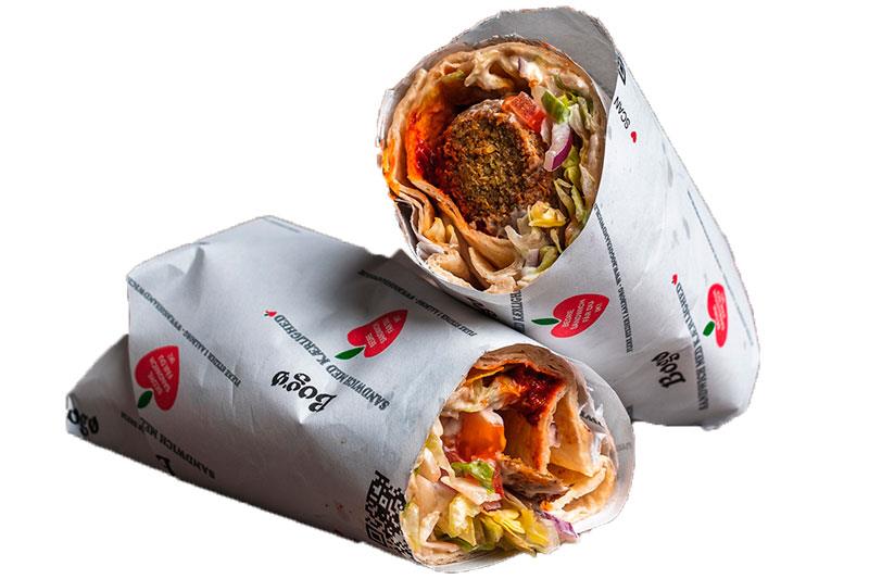 Falafel er tilberedt med frisk icebergsalat, tomat, agurk, rødløg og creme fraiche dressing.