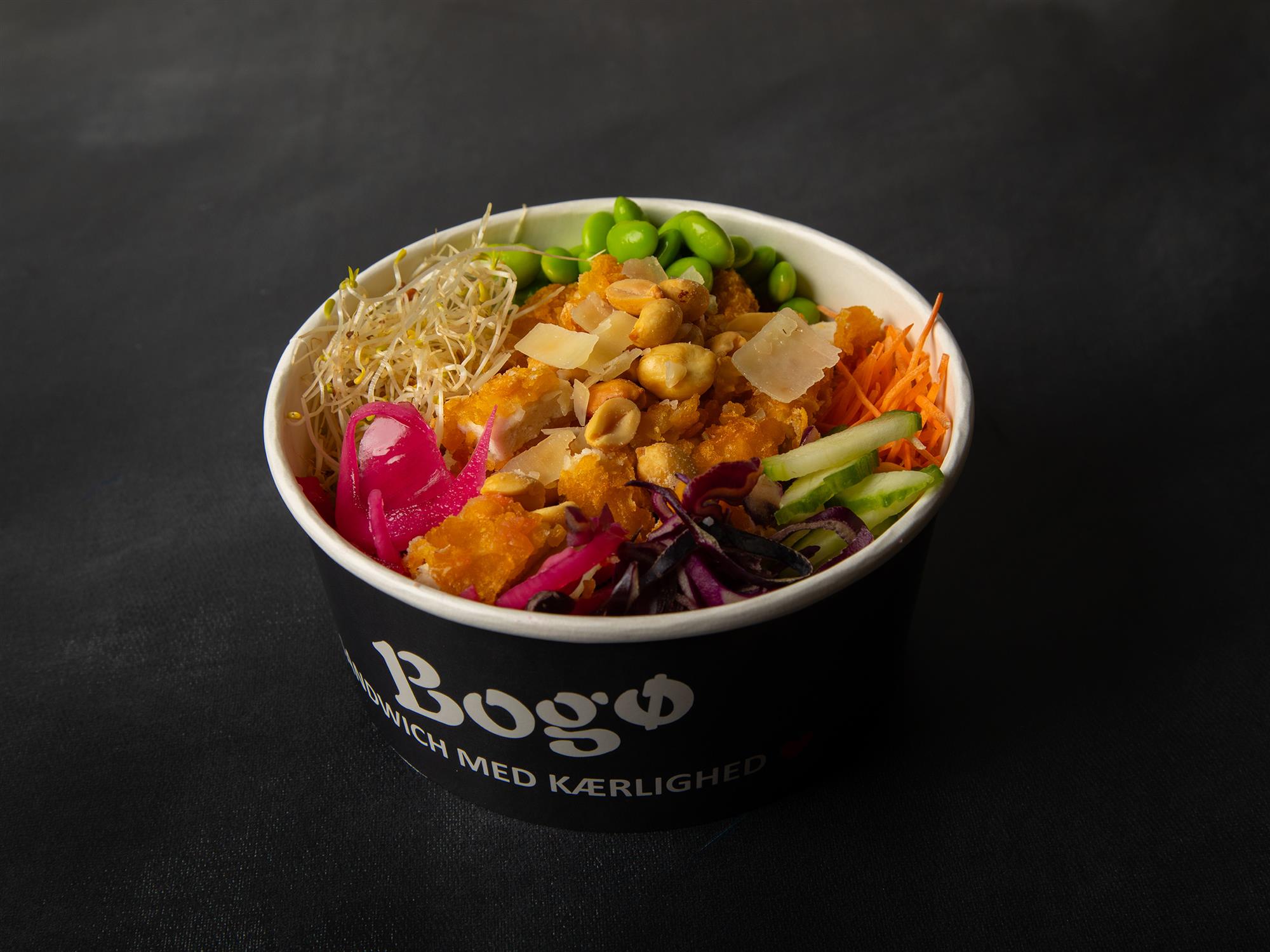 Hjemmesyltede rødløg, edamame bønner, revet frisk rødkål, lucernespire, revet agurk,revet gulerødder, peanuts, parmesan, pasta, iceberg, årstidens salat. Nyhed - Sushi ris m. sushi sauce kan vælge i stedet for pasta.