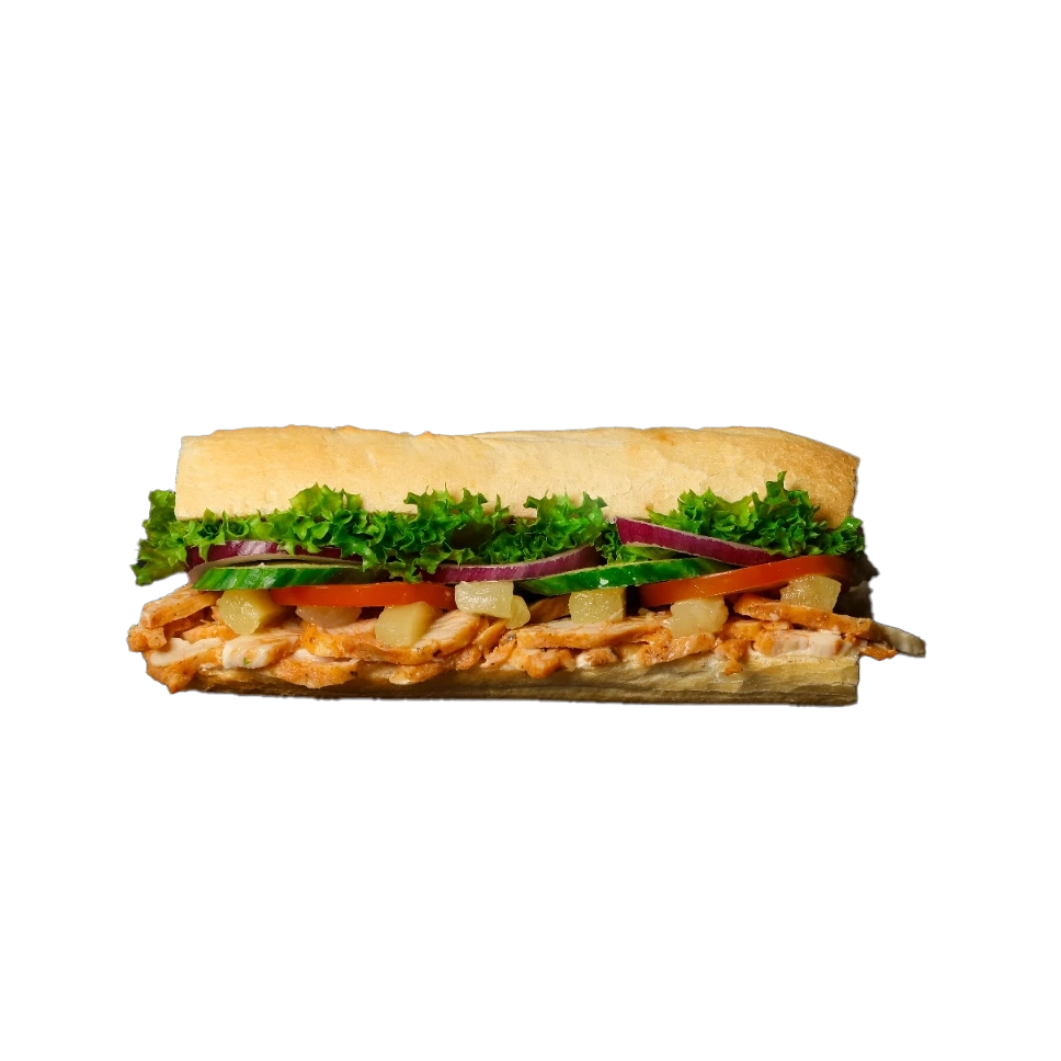 Kylling, ananas, frisk icebergsalat, mayonnaise, tomat, agurk, løg, krydderiblanding