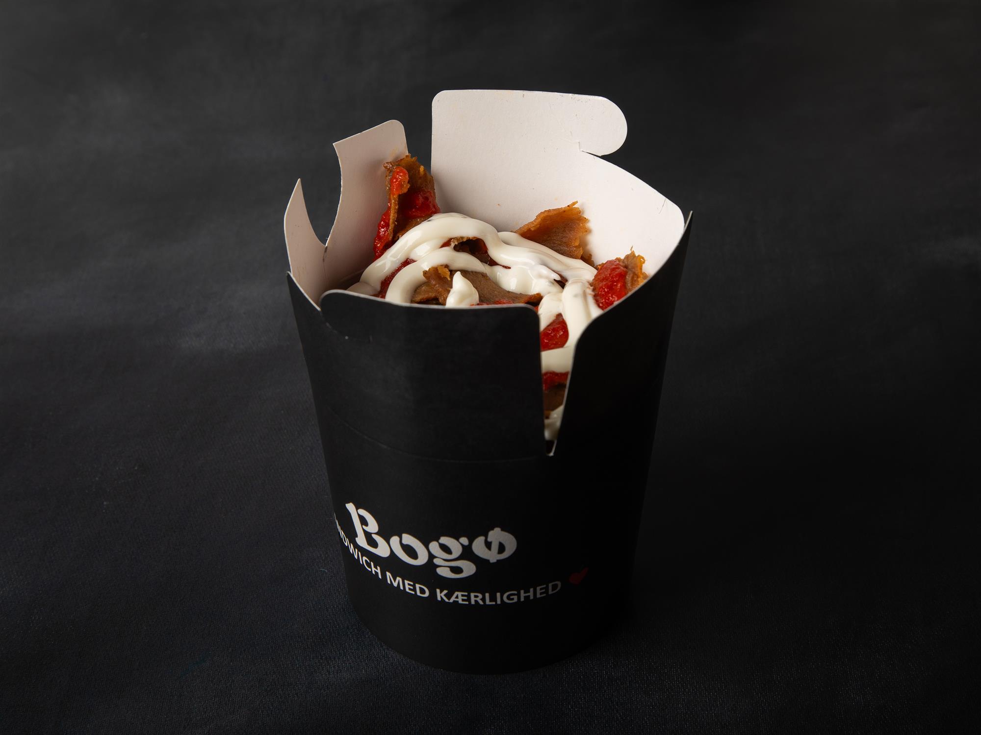 Kebab, pommes frites, creme fraise dressing og rød dressing
